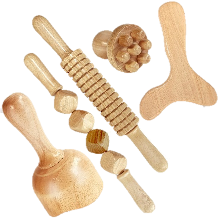 herramientas de madera para mejorar la circulación, reducir celulitis, tonificar músculos y promover bienestar físico y emocional.
